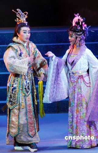 十一月三日晚,有臺灣“無敵小生”美譽的歌仔戲“頭牌”女藝人孫翠鳳(左)首度亮相上海,公演《劍神呂洞賓》,引發上海新老戲迷轟動。孫翠鳳所在的臺灣明華園是時下寶島首屈一指的歌仔戲劇團。繼1990年赴北京公演後,此番明華園將首度在上海、杭州、南昌、深圳等城市舉行規模空前的內地巡演。 中新社發 明華園 攝