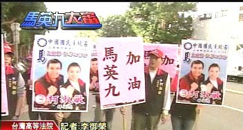 臺灣“高等法院”審理馬英九特別費案,今天宣告馬英九無罪,法庭外的藍軍支持者興奮高喊“凍蒜”(當選)口號。(東森新聞圖)