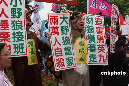 三月三十一日下午,中國國民黨在臺北市舉辦反正名、反去蔣化、反對拆除中正紀念堂圍牆的大遊行。圖為化裝的遊行者。中新社發 耿軍 攝
