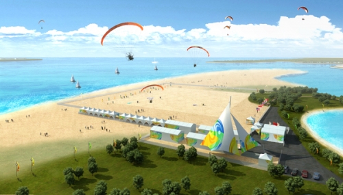 位于海陽鳳翔灘D區(海陽旅遊度假區盛龍建國飯店西南側沙灘),佔地面積31000m2,設置臨時觀眾觀看區,該項目西側為東村河入海口,水域景色從空中俯瞰壯麗無比。西北側為生態體育場,從空中俯瞰為一滴晶瑩的水珠,兩景交相輝映,為動力滑翔傘比賽增添了優美的景色。功能區設置了體育競賽區、場館禮賓區、安保及交通運行區、新聞運行區、場館運行區及觀眾活動區。該項目距離亞運村3.5km,約10分鐘車程。