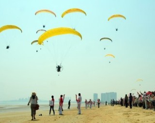 第三屆亞沙會火炬在濟南傳遞 滑翔傘上空隨行