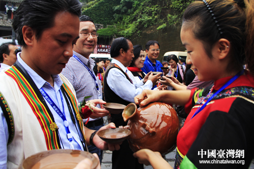 恩施土司城前,土家女為遠道而來的臺灣少數民族客人斟酒