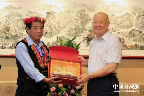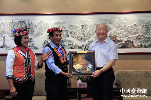 湖北省副省長田承忠25日下午在恩施會見了率臺灣少數民族代表前來參加恩施女兒會的中華海峽兩岸少數民族交流協會理事長簡東明一行,會後雙方互贈禮物。(中國臺灣網 楊麗 攝)