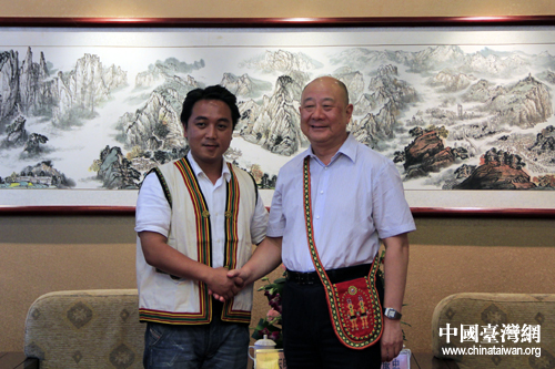 湖北省副省長田承忠(右)25日下午在恩施會見了率臺灣少數民族代表前來參加恩施女兒會的中華海峽兩岸少數民族交流協會理事長簡東明(左)一行。(中國臺灣網 楊麗 攝)
